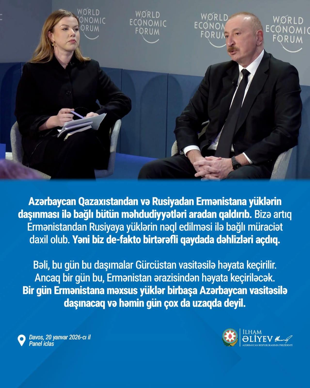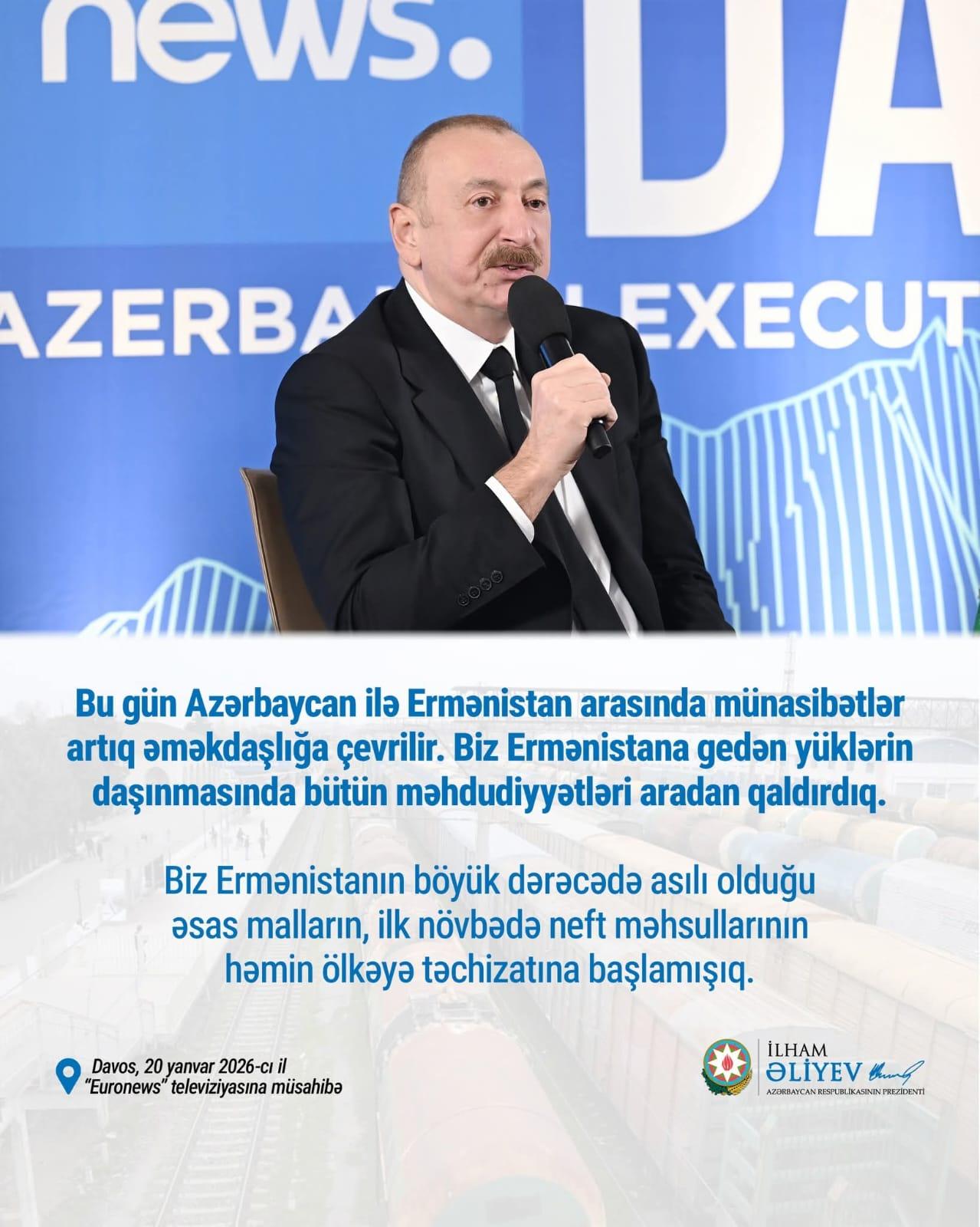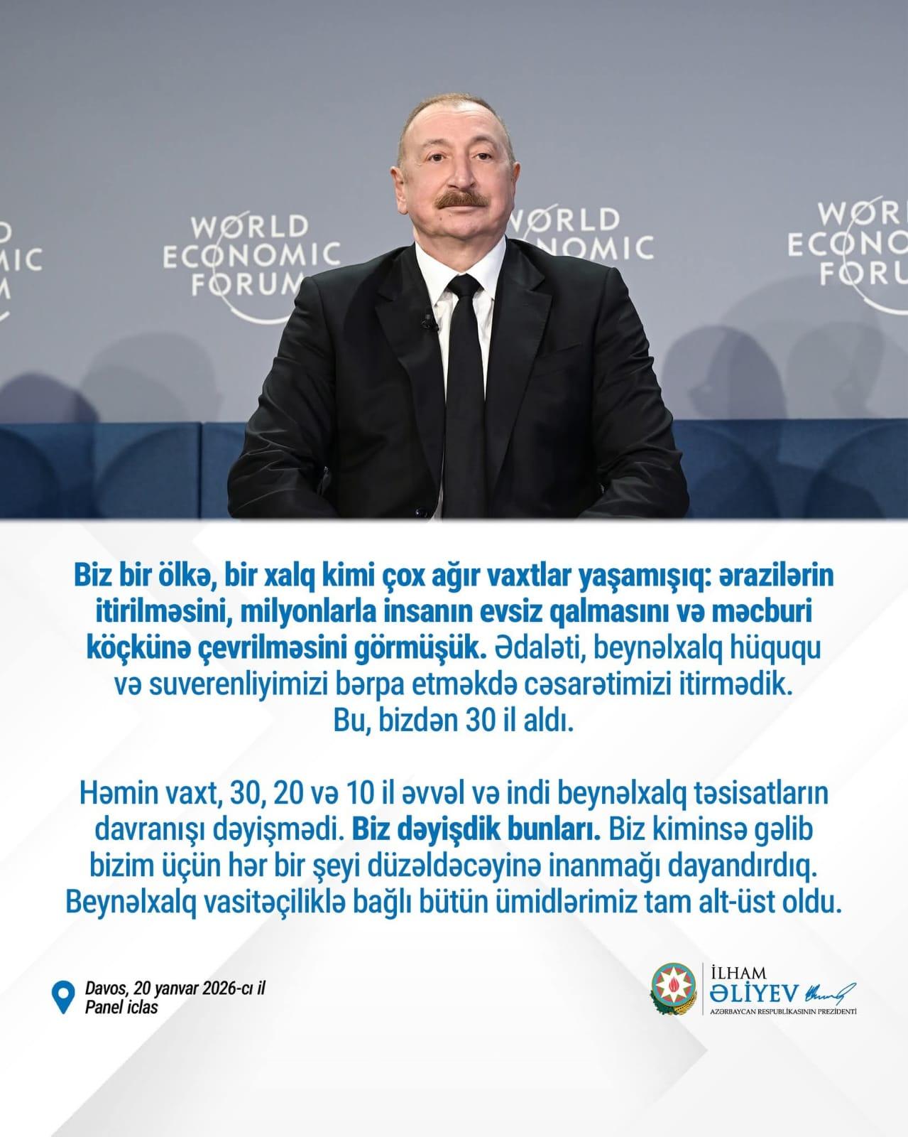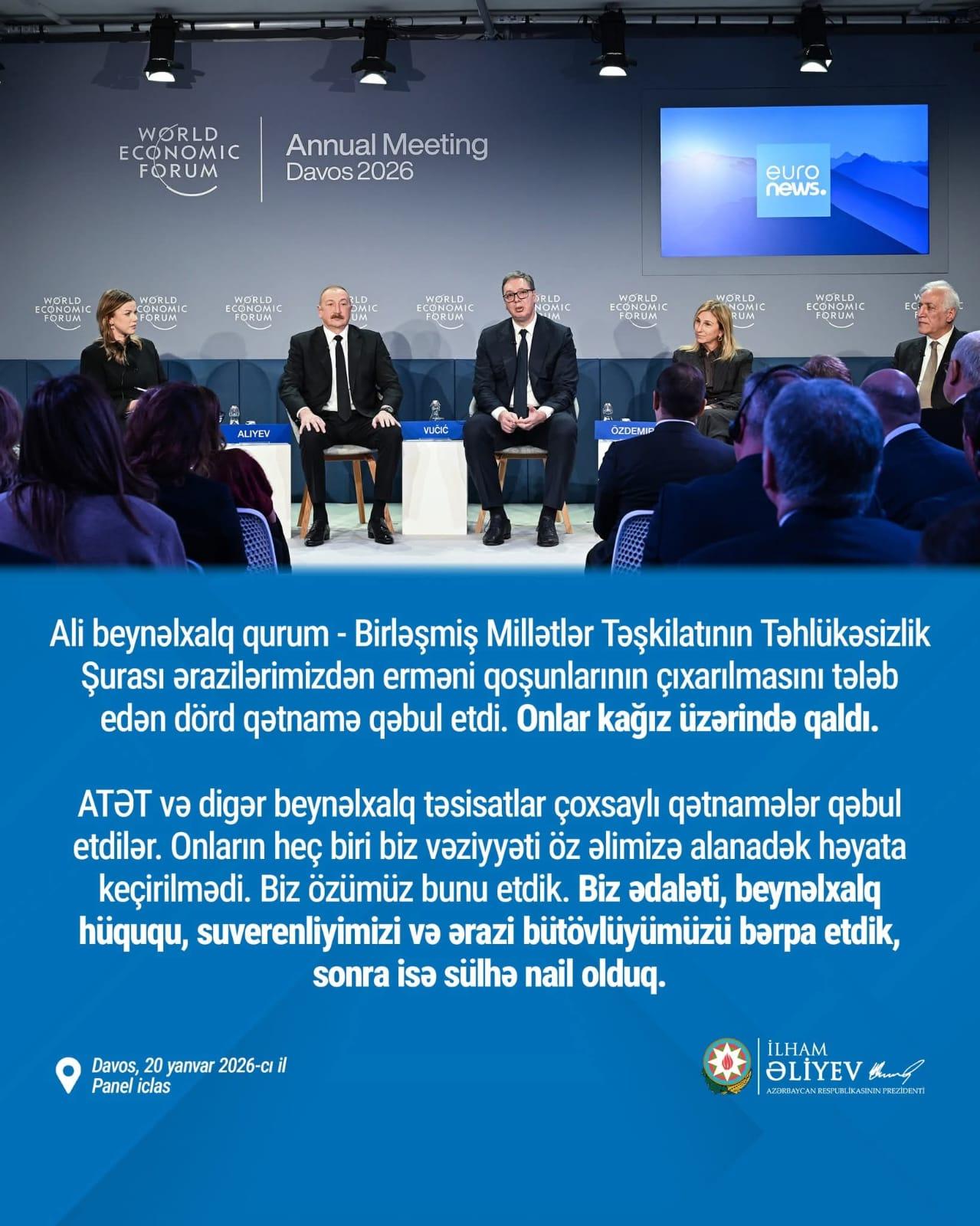 Yanvar ayının 20-də Azərbaycan Respublikasının Prezidenti cənab İlham Əliyev Davosda “Euronews” televiziyasına verdiyi müsahibəsində bildirib ki, strateji məqsədimiz milli maraqlar əsasında nəticələri əldə etməkdən ibarət idi və beynəlxalq hüquqa tam riayət edərək düzgün hesab etdiyimizi həyata keçirmək idi. Gördüyümüz hər bir iş - istər siyasi inkişaf, istərsə də suverenliyimizin və ərazi bütövlüyümüzün bərpası beynəlxalq hüquqa və ümumi dəyərlərə uyğun idi. Beynəlxalq münasibətlər bu gün yeni eraya qədəm qoyur. Bu erada vəziyyəti qanunun aliliyi deyil, güc qaydası idarə edir. Bunu dünyanın müxtəlif yerlərində görə bilərik. Hər ölkə öz strategiya və siyasətini özünün potensialına uyğunlaşdırmalıdır, mümkün qədər çox ölkələrlə, ilk növbədə öz bölgəsində, sonra isə qlobal müstəvidə yaxşı münasibətlər qurmalıdır. Azərbaycan məhz buna nail oldu.