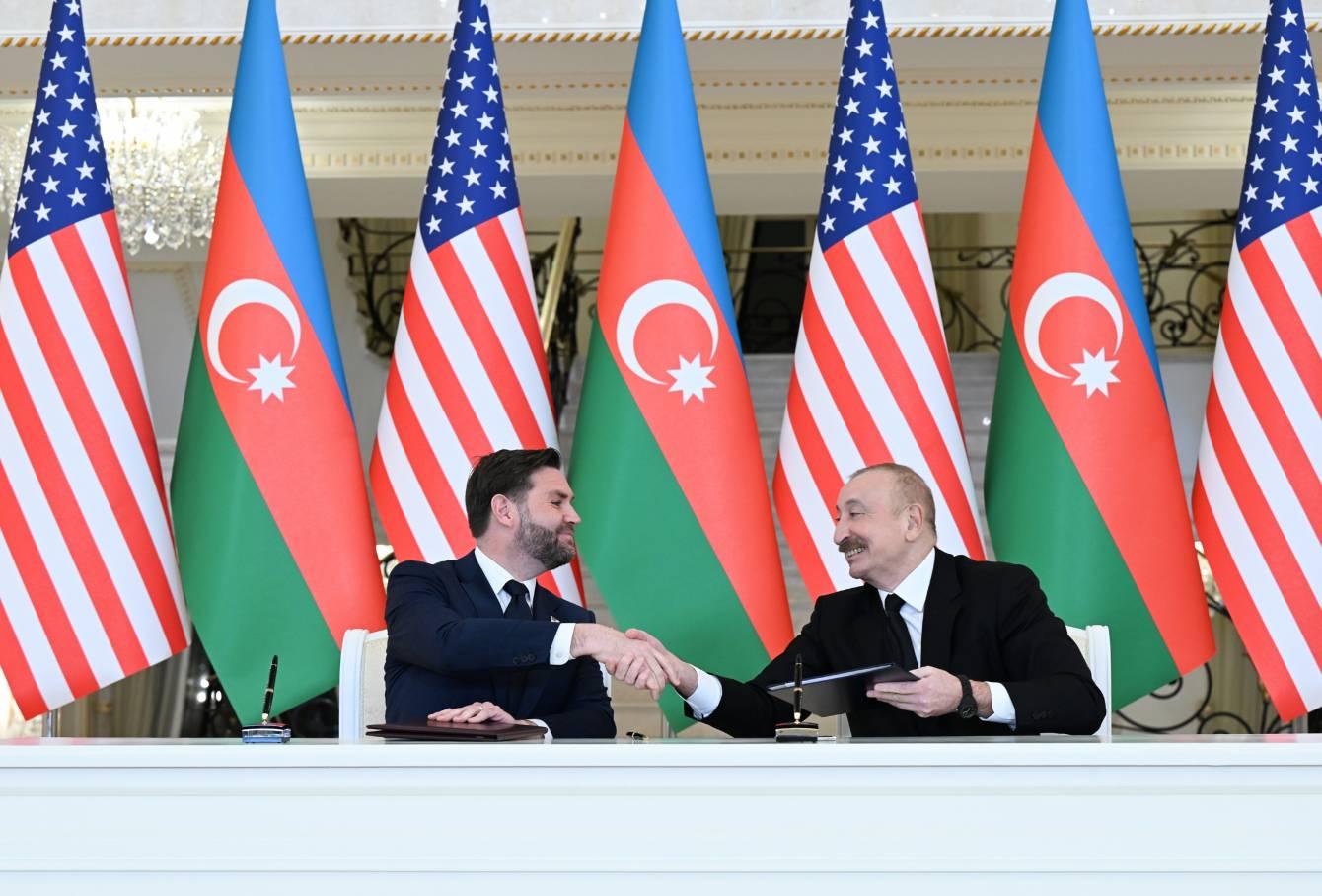 Amerika Birləşmiş Ştatlarının Vitse-prezidenti Cey. Di. Vensin Azərbaycana rəsmi səfəri çərçivəsində fevral ayının 10-da Azərbaycan Respublikasının Prezidenti İlham Əliyev və ABŞ-ın Vitse-prezidenti Cey. Di. Vens mətbuata bəyanatla çıxış ediblər. Bəyanatın əvvəlində İlham Əliyev Azərbaycana olan çox müsbət münasibətə görə, Qafqazda sülhə verdikləri töhfəyə görə Tramp-Vens administrasiyasına minnətdarlıq edib. Bildirib ki, Strateji Tərəfdaşlıq haqqında Xartiyanın imzalanması mərasimi heyətlərin altı ay ərzində gördüyü çox gərgin işin təzahürüdür. Altı ay əvvəl Prezident Trampla Vaşinqtonda tarixi görüş və Strateji Tərəfdaşlıq haqqında Xartiyanın tərtib edilməsi üçün işçi qrupunun yaradılması haqqında sənədin imzalanması ikitərəfli əməkdaşlıq üçün yeni imkanlar yaratmışdır. Tramp-Vens administrasiyasının regionumuzdakı səylərinin mühüm nəticələrindən biri Beynəlxalq Sülh və Rifah naminə Tramp Marşrutu – TRIPP layihəsidir ki, o, nəinki Azərbaycanın iki hissəsini birləşdirəcək, o cümlədən Azərbaycan, Ermənistan və digər qonşuların ərazisi vasitəsilə Asiya ilə Avropanı birləşdirəcək çox etibarlı, təhlükəsiz və böyükmiqyaslı daşımalar dəhlizidir. Beləliklə, regionda sülh sahəsində əldə olunmuş nəticələr gücləndirilir. Bu gün Birləşmiş Ştatlarla Azərbaycan arasında münasibətlər tamamilə yeni mərhələyə qədəm qoyur.