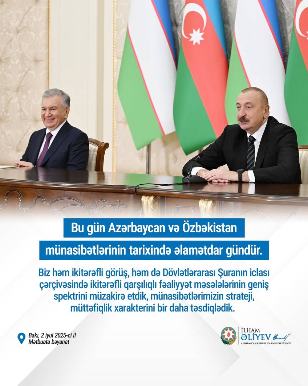 Özbəkistan Respublikasının Prezidenti Şavkat Mirziyoyev iyulun 2-də Azərbaycan Respublikasına dövlət səfərinə gəlib. Hər iki ölkənin Dövlət bayraqlarının dalğalandığı Heydər Əliyev Beynəlxalq Aeroportunda ali qonağın şərəfinə fəxri qarovul dəstəsi düzülüb. Həmçinin iyulun 2-də Azərbaycan Respublikasının Prezidenti İlham Əliyevin Özbəkistan Respublikasının Prezidenti Şavkat Mirziyoyevlə təkbətək görüşü olub. ...
